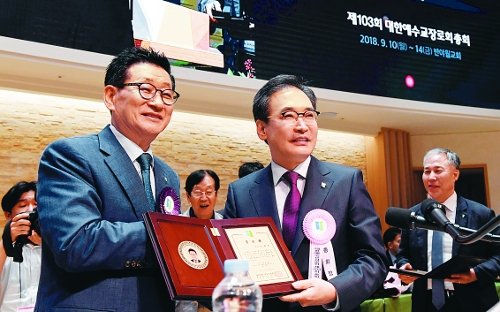 이승희 예장합동 신임총회장(왼쪽)이 10일 대구 반야월교회에서 개회된 제103회 총회에서 전계헌 직전 총회장으로부터 의사봉, 헌법서 등을 건네받고 있다