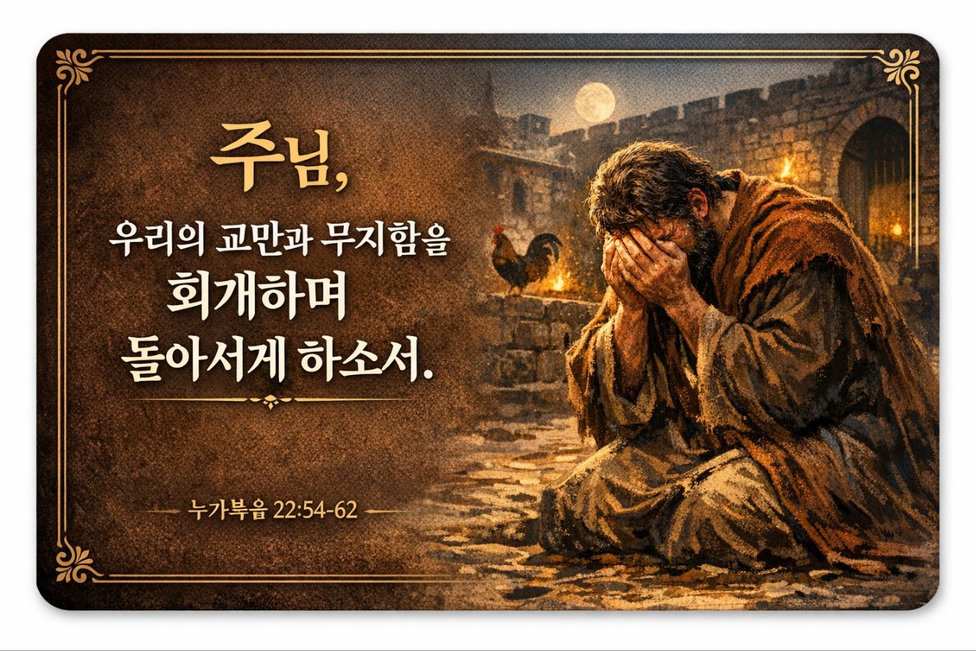 주님이 죄인처럼 붙들려 서 계실 때, 끝까지 곁에 머물렀으나 끝내 부인했던 그의 연약함이 바로 우리의 모습임을 인정합니다. 닭 울음소리 앞에서 주님의 말씀을 기억하고 밖에 나가 통곡했던 베드로처럼, 오늘 우리도 주님의 시선 앞에서 스스로의 무지와 교만을 깨닫게 하옵소서. 자신의 힘과 능력을 의지하며 모든 것을 이루었다고 외치던 느부갓네살 왕이 한순간에 무너졌듯, 재물과 건강과 체제를 의지하는 우리의 확신이 얼마나 허망한지 보게 하옵소서. 하나님의 때는 더딘 것처럼 보여도, 그 날과 그 시는 누구도 알 수 없음을 잊지 않게 하옵소서.