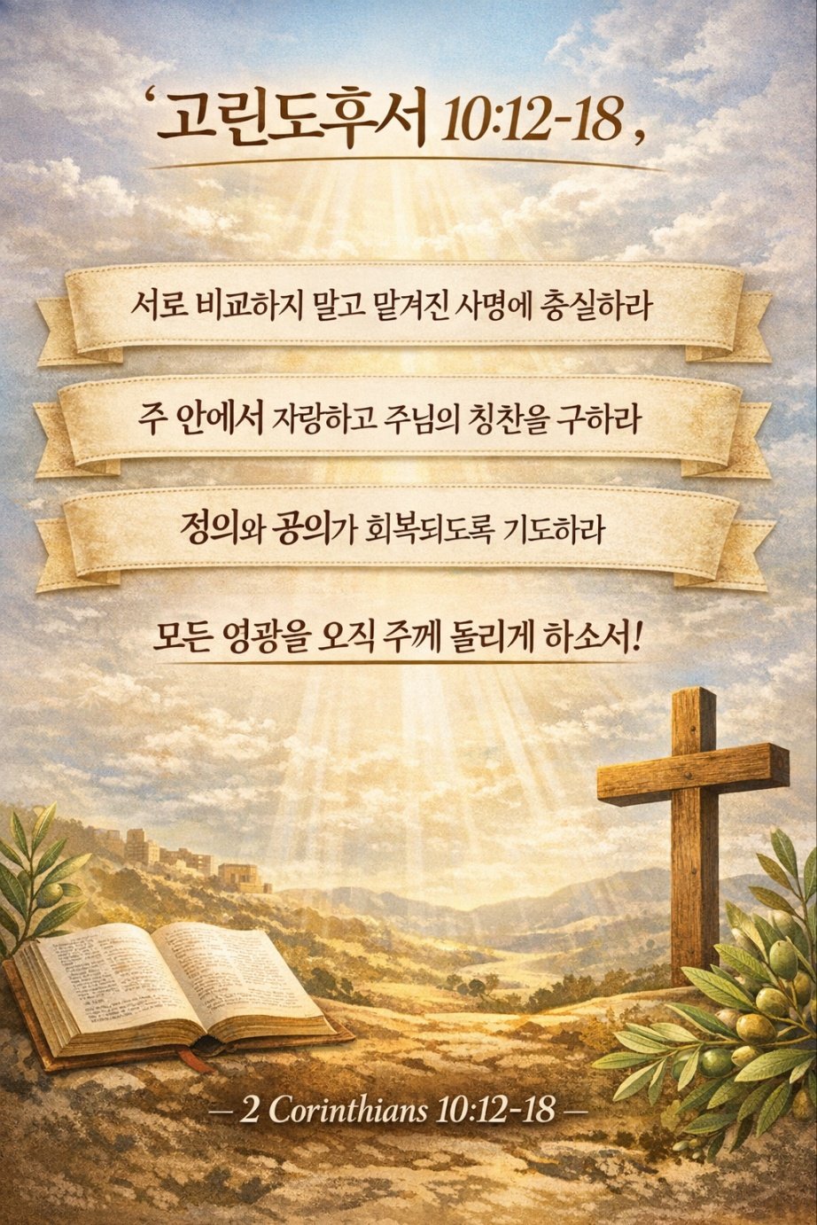 우리는 끊임없이 비교하는 시대를 살아갑니다. 비교는 낙심을 낳고, 때로는 교만을 키웁니다. 바울은 이러한 경쟁과 자기 과시를 단호히 거절합니다. 성도의 절대 기준은 사람의 박수가 아니라 하나님의 부르심입니다.