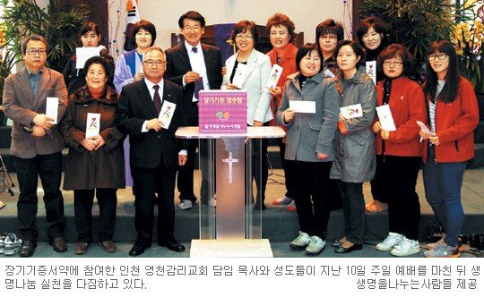 사순절 4째주 주일인 지난 10일에는 감리회 중부연회 인천북지방 영천교회(김현 목사)에서 장기기증서약식이 열렸다. 교회창립 76주년 기념으로 열린 이날 행사에서 김현 목사를 비롯한 신도 20여명이 사후 각막을 비롯해 뇌사 시 장기기증과 사후조직(뼈, 연골, 피부)을 기증하기로 서약했다.