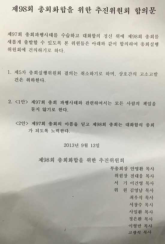 △‘제97회 총회의 아픔을 딛고 제98회 총회는 대화합의 총회가 되도록 노력한다’가 2안이었는데 1안으로 최종 합의를 본 것.