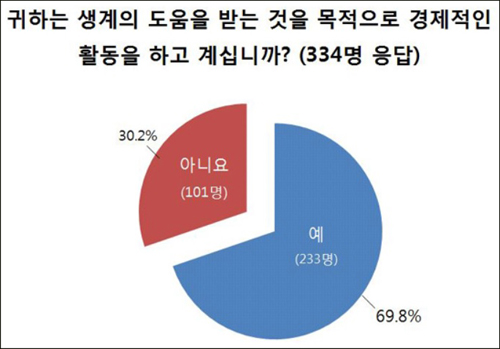 다른 경제적 활동을 하고 있으며, 이들 가운데 69.8%(233명)는 생계에 도움을 받기 위해 일을 한다고 답했다.