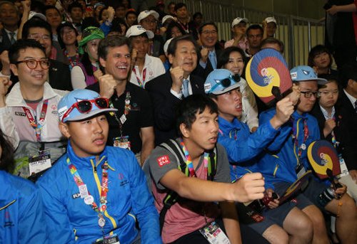 1일 ‘2015로스앤젤레스 하계 스페셜올림픽 세계대회’가 열리는 로스앤젤레스 LA컨벤션센터를 찾아 조직위 관계자, 한국 선수들과 함께 파이팅을 외치고 있다.