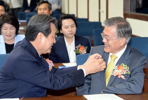새정치민주연합 문재인 대표에게 대회 배지를 달아주고 있다.