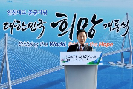 이명박 대통령은 16일 오후 영종도 쪽 인천대교 요금소 광장에서 개최된 인천 송도와 영종도를 잇는 인천대교 개통식에 참석했다.