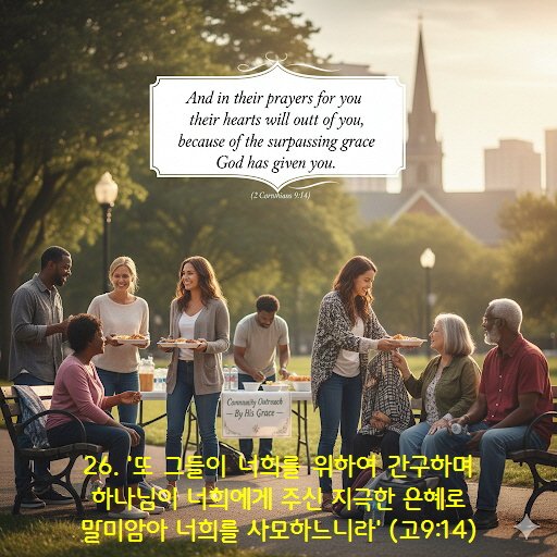 바울은 고린도 교회의 연보로 인해 유대인 성도들이 이방인 성도들을 사모하며 그들을 위해 기도하게 될 것이라고 기대했습니다. 바울에게 유대인과 이방인 사이의 장벽은 복음 전파 사역의 큰 걸림돌이었습니다. 그런데 고린도 교회의 연보가 그 장벽을 무너뜨리는 역할을 하게 된 것입니다. 헌금은 우리가 하나님의 선한 역사에 동참하게 하는 특권입니다. 한금을 드릴 수 있는 자체가 큰 복이라는 사실을 잊지 마십시오. 아울러 감사하는 마음으로 헌금을 드려 채우시고 풍성하게 하시는 하나님의 은혜를 경험하시길 바랍니다.