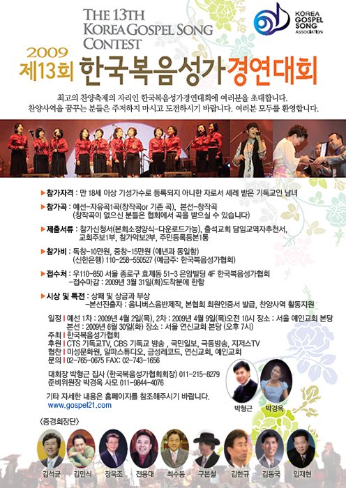 국내 찬양사역자 발굴과 미자립 교회 지원에 힘써온 한국복음성가협회(회장 박형근)는 ‘제13회 한국복음성가 경연대회’를 개최한다.