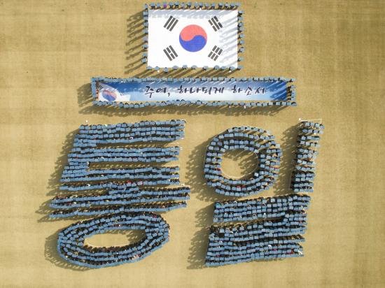 통일기금 약정과 통일 기원 퍼포먼스를 진행했고 이들은 군청색 카드를 머리 위로 들어올리며 '통일'이라는 대형글자를 완성했다.