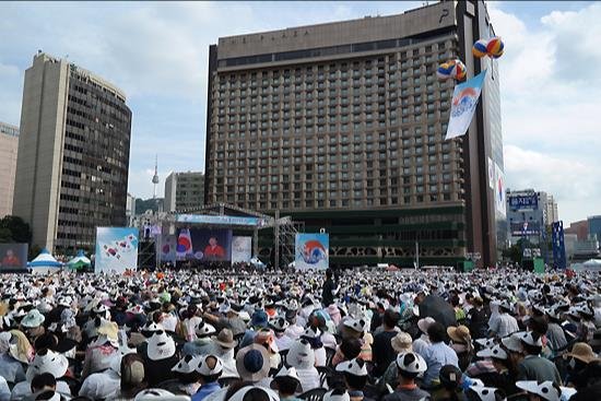 30도가 넘는 폭염 속에도 기도회를 드리기 위해 광장은 가득 찼고 미처 자리 잡지 못한 이들은 광화문과 남대문 사이 세종로에 설치된 스크린 앞으로 모였다.