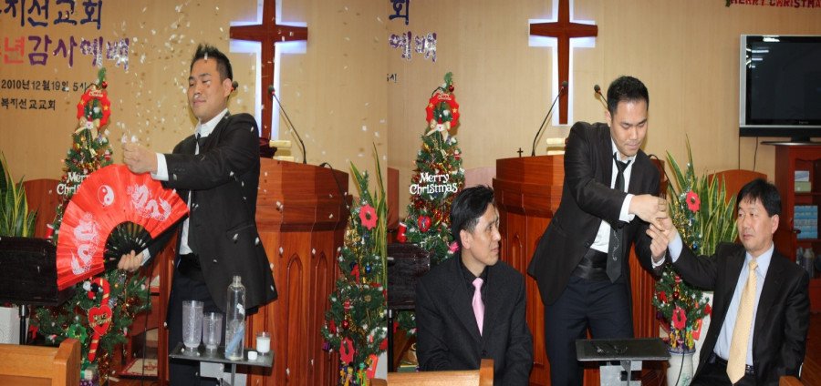비둘기마술과 꽃가루 날리기 마술 등등 여러 가지를 참석자들을 위해 열연하였으며 많은 박수로 환호를 받았다.