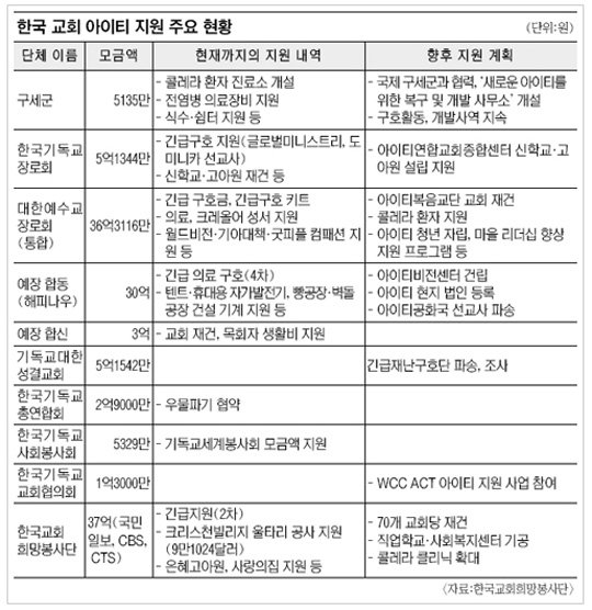 모금액 190억원 중 지난해 30-40% 집행한편 이날 보고회에서는 아이티연합 구성 교단 및 단체의 지난 1년간 지원 내역과 향후 지원계획이 보고됐다.