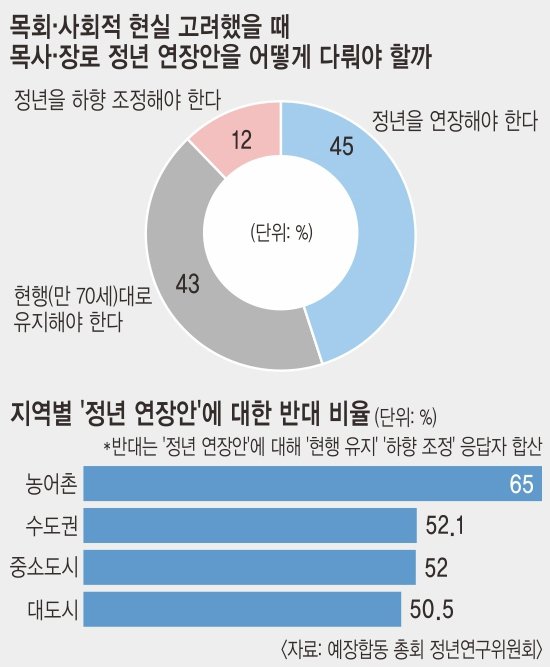 또 응답자가 소속된 교회의 성도 수가 많을수록, 응답자의 연령이 낮을수록 정년 연장에 반대하는 비율이 높은 것으로 조사됐다.