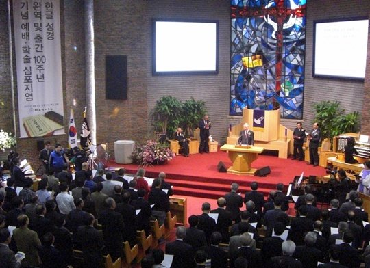 대한성서공회(이사장 김순권)는 4일 서울 연지동 연동교회(이성희 목사)에서 ‘한글 성경 완역 및 출간 100주년을 기념하는 예배’를 드렸다. 설교자로 나선 실천신학대학원 총장 은준관 목사는 한국교회 안에 성경의 권위가 회복돼야 함을 역설했다.