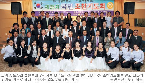 나라의 발전과 정치안정, 경제성장을 위해 정기적으로 기도하는 제23회 국민조찬기도회가 9일 서울 여의도 국민일보 빌딩 코스모홀에서 교계지도자와 회원 등 200여명이 참석한 가운데 열렸다