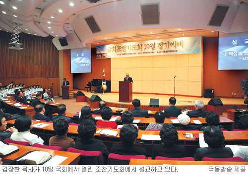대한민국 국회조찬기도회 정기예배가 10일 오전 서울 여의도 국회 헌정기념관 대강당에서 열렸다. 여야 국회의원을 비롯, 각계각층의 크리스천 300여명이 참석한 이날 예배에서는 극동방송 이사장 김장환 목사가 메시지를 전했다. 김장환 목사는 '내 백성을 보내라'를 주제의 설교를 통해 12월 대통령 선거를 위해 크리스천들의 적극적인 기도와 관심, 동참을 호소했다.