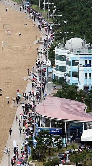 부산 해운대해수욕장에 길이 1km에 달하는 긴 줄이 생겼다.