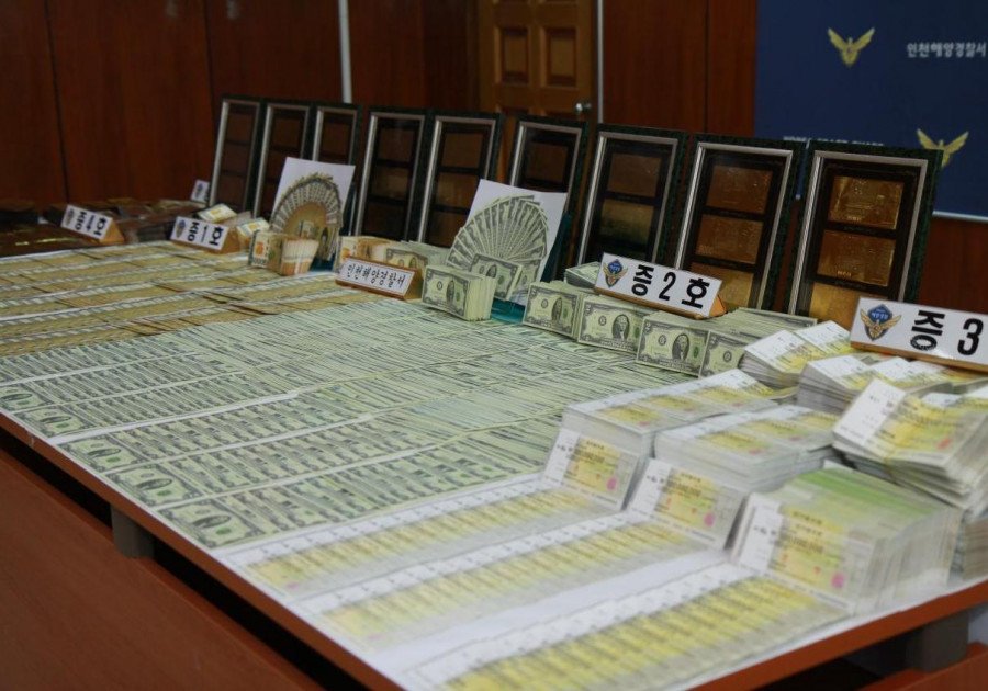 ♨ 인천해양경찰서는 시중 00은행의 액면가 1억원 자기앞수표 모조품 2,000장과 5만원권 금박지폐 1,000장 및 미국 2달러 모조품 1,950장 등을 제작.유통 시키려한 업자 이모씨(37세)등 관련자 10여명을 검거하고 모조지폐 총 7,000여장과 화폐문양인쇄프린터기 6대 등 지폐의 액면가로 보면 약3천9백억원 상당의 물품을 압수하여 조사 진행 중이라고 밝혔다.