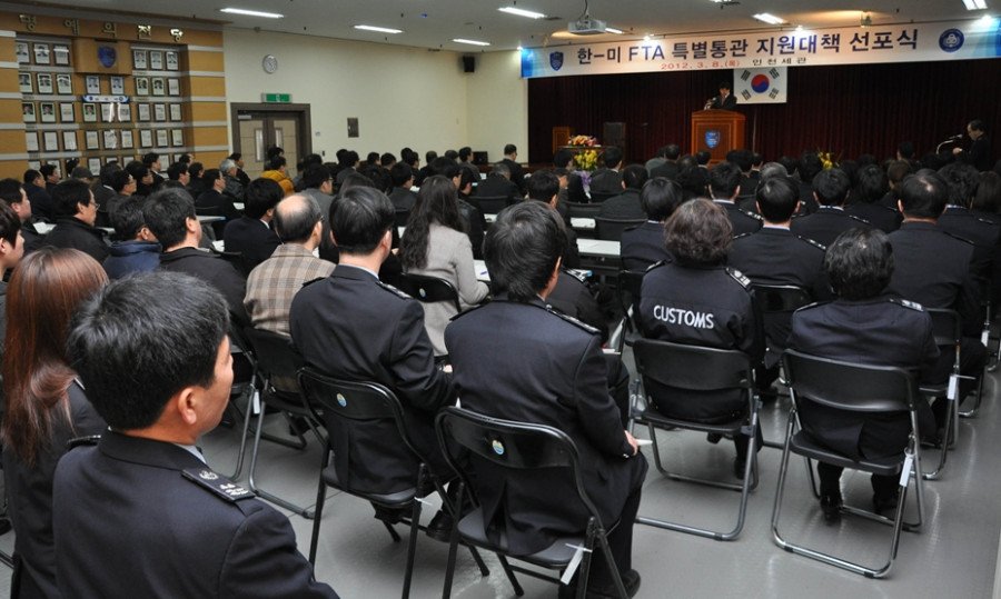 ♨ 세관은 이날 무역협회 인천지부, 경기경제단체연합회 등 인천.경기지역 8개의 FTA 유관기관 임직원과 세관직원, 관세사 등과 함께『한-미 FTA 특별통관지원 대책 및 선포식』을 갖음