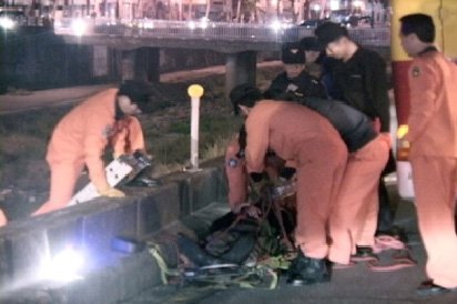 서울 신림본동에서 오토바이를 몰던 26세 김모씨 등 두명이 도로 난간과 추돌 후 개천으로 떨어져 관악소방서(서장 김위환) 119구조대가 구조하고 있다.