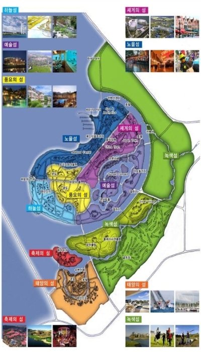 이를 위해 풍부한 수자원을 바탕으로 "물의 도시"를 구현해, 8개의 섬(예술섬, 태양의섬, 축제의섬, 풍요의섬, 하늘섬, 노을섬, 녹색섬, 세계의 섬)을 각각 고유의 기능으로 구성하되 각각 상호 연계가 가능한 복합 관광도시로 조성된다.