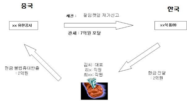- 세관에 신고한 물품대금은 은행을 통하여 정상지급하고 저가신고한 차액 대금은 휴대밀반출하여 중국으로 지급