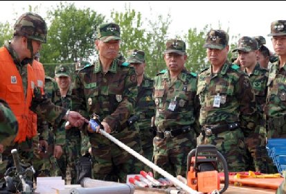 제3야전군사령부는 22일 현재 작전책임지역의 6개지역 7만3000㎡를 대상으로 지뢰제거작전을 수행하고 있는 가운데 이상의 3군사령관이 지뢰제거 장비를 점검하고 있다.