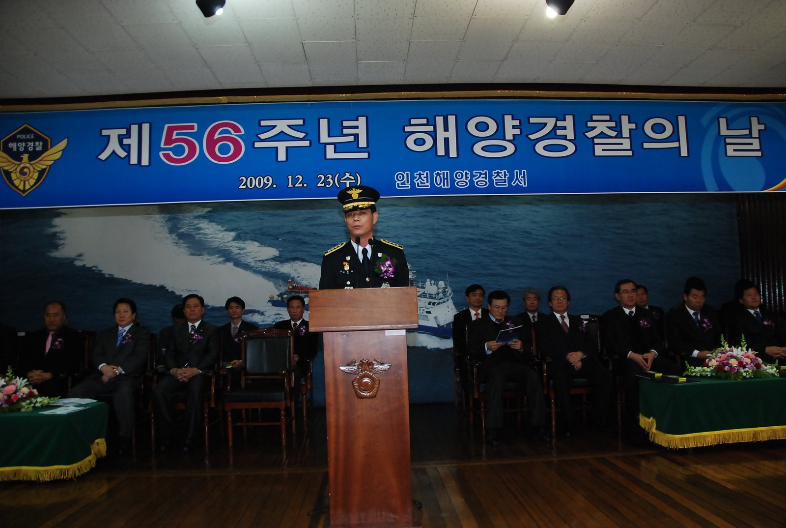 이날 기념식 행사에는 인천해양경찰 서장이 정운찬 국무총리의 치사를 대독, 「해양경찰 창설 제56주년을 진심으로 축하 한다」는 메시지와 「해양주권수호와 한반도 해역의 법질서 확립, 바다 안전망 구축, 해양환경보전을 통해 국민의 생명과 재산을 보호하는 충직한 바다의 파수꾼으로 최선을 다해주기 바란다」는 당부의 내용을 대독했다.