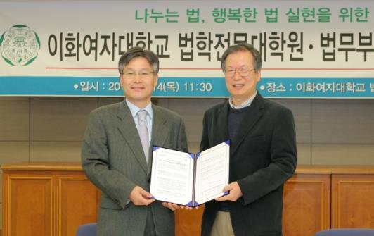 법무부와 이화여자대학교 법학전문대학원은 1월 14일 업무협약을 맺고, ‘나누는 법, 행복한 법’ 실현을 위한 법 교육 공동사업을 벌이기로 했다. 이화여자대학교 법학전문대학원은 남녀평등을 지향하는 법체계에 대한 연구 분야인 ‘젠더법 분야’와 인간과 생명의 존중에 기반 한 ‘생명의료법 분야’에 전문성을 갖춘 봉사활동을 벌여나갈 예정이다.