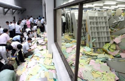 2일 오전 경기 수원 아주대병원 의무기록실에서 진료차트를 보관한 책장이 연쇄적으로 넘어지며 간호사 3명이 부상당하는 사고가 발생, 소방대원과 직원들이 진료차트 정리작업을 벌이고 있다.