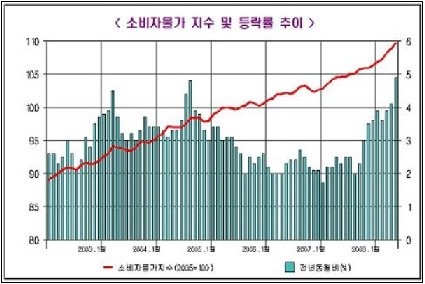 통계청은 6월2일 ‘2008년 5월 소비자물가동향’을 발표하고, 석유류와 금값, 도시가스, 돼지고기 등이 최근 가파르게 오르면서 5월 소비자물가 상승을 주도했다고 설명했다.