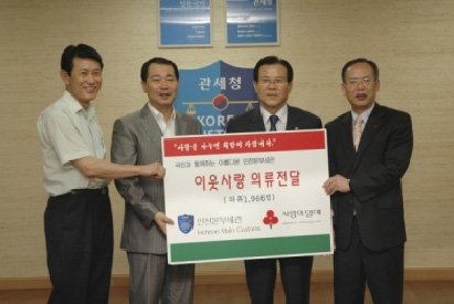 ♥ 인천세관(세관장: 김두기)은 2008년 7월 29일 사건이 종결되어 몰수 확정된 위조상표(일명“짝퉁”)의류 1,966점을 인천광역시사회복지공동모금회(회장: 김민기)에 기증하는 「사랑 나눔 실천 행사」를 가졌다.