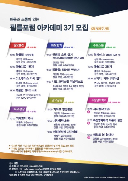필름포럼 아카데미 3기, 10월 4주부터 5장르-17강좌로 진행