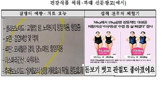 신문광고의 허위과장광고 유형은 크게 2가지로, 질병예방·치료에 효과가 있다거나 섭취 전후의 체험기를 광고하는 내용이 주를 이뤘다.
