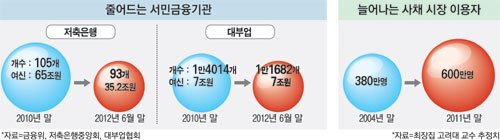 경기 침체로 삶이 더욱 팍팍해지는 서민들이 사채시장으로 내몰리고 있다. 대표적인 서민금융사인 저축은행과 대부업체들이 위축되면서 서민들이 결국 살인적인 금리를 감당해야 하는 불법 사금융시장으로 발길을 옮겨야 하기 때문이다.