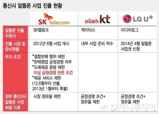 이에 따라 미래부는 △모회사 이동통신 서비스를 포함한 결합상품 판매제한 △모기업 유통망 및 마케팅비 보조 금지(판매영업 공정경쟁 의무) △도매제공 여유용량의 계열사 부당지원 금지 등 2012년 SK텔링크 알뜰폰 진출 당시 부과했던 공정경쟁 등록조건 외에 시장점유율 제한 등 독과점 방지를 위한 강력한 추가 조건을 붙이겠다는 방침이다.