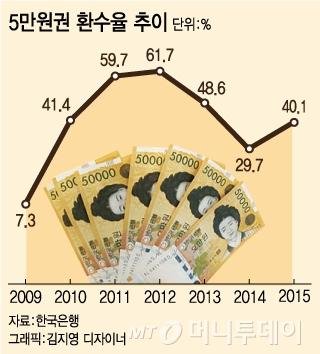 시중에 5만원권 10장이 풀리면 6장은 돌아오지 않는다는 뜻이다. 같은 기간 1만원권 환수율이 90%가 넘는 것과 비교된다.