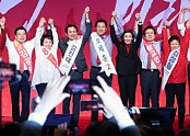 2월 18일 대구에서 열린 자유한국당 전당대회 합동연설회에서 당 대표, 청년최고위위원, 최고위원 후보들이 당원들에게 인사하고 있다