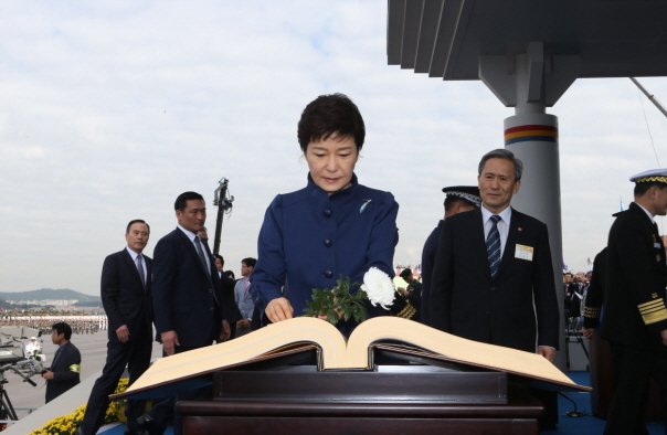 박근혜 대통령이 1일 오전 경기 성남 서울공항에서 열린 건군 65주년 국군의 날 기념식에서 전사자 명부에 헌화하고 있다.