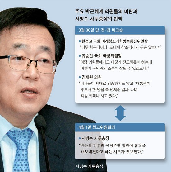 새누리당 서병수 사무총장의 발언이 당내에 미묘한 파장을 낳고 있다. 서 총장은 '박근혜 직계'로 분류된다. 그는 1일 당 최고위원회의에서 "새 정부가 출범한 지 이제 한 달여밖에 지나지 않았음에도 벌써부터 박근혜 정부의 국정운영 철학에 흠집을 내보겠다는 시도가 엿보인다. 예컨대 창조경제를 놓고 이런저런 시비가 벌어지고 있다"고 말했다.