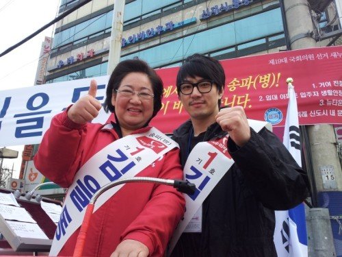 김 후보의 선거노래가 흘러나오는 차량 근처에는 "송일국이 진짜 왔어? 맞아?"하며 아들 송씨를 보기 위해 모여드는 사람이 더 많았다.