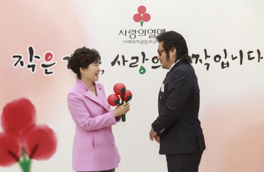 박대통령은 청와대를 방문한 허동수 사회복지공동모금회장과 ‘사랑의 열매’ 홍보대사인 방송인 김보성(48), 전제향(32)씨로부터