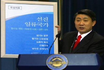 국정지표는 대통령직 인수위가 건의한 내용을 바탕으로 대한민국의 역사를 건국-산업화-민주화 과정을 거쳐 선진화로 가는 과정으로 인식하고, 국가비전을 ‘선진 일류국가’로 했다.