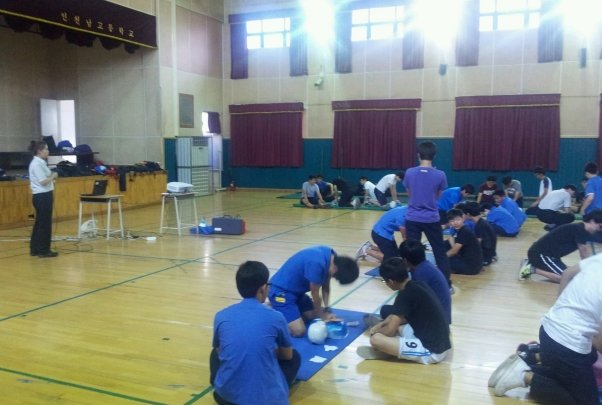♨ “4분의 기적실현” 즉, 심정지 환자가 4분을 넘기게 되면 뇌로 공급되는 혈액이 중단되어 치명적인 뇌손상을 초래하므로 4분 이내에 심폐소생술(CPR)을 해야 한다. 이에 인천남고등학교 학생 및 교직원들에게 심폐소생술 방법을 몸소 익히게 하기 위해 전문강사가 기본심폐소생술의 필요성 및 심폐소생술 교육용 장비를 이용해 체험위주의 실습교육을 하였다.