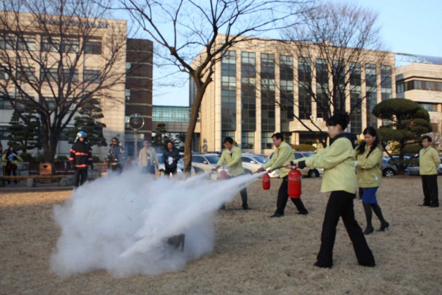 ♨ 비상 상황에 대한 대처능력 향상을 위해 실시된 이번 훈련은 화재 발생시 인명대피 및 진압 훈련에 중점을 두고 진행되었고, 공공기관의 방화관리에 관한 규정에 따른 ▲자위소방대의 초기 소화활동 ▲소방시설 작동 및 활용법 숙지 ▲신속한 피난대피 및 요구조자 인명구조 ▲소방차 출동로 확보 및 특수차 활용방안 등을 점검하였으며, 또한 응급환자가 발생할 경우를 대비하여 구급대원과 함께 심폐소생술(CPR) 등 응급처치 교육을 병행 실시했다.