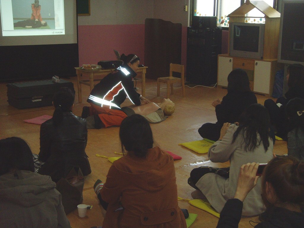 ♨ 이번 응급처치교육은 1급 응급구조사 자격을 갖춘 구급대원이 전담강사로 지정되어 마네킹을 이용한 기도폐쇄 응급처치(하임리히법)와 심폐소생술(CPR) 실습을 통하여 유치원생들에게 실제상황 발생시 신속히 대처할 수 있는 능력을 배양하는데 중점을 두고 실시했다.