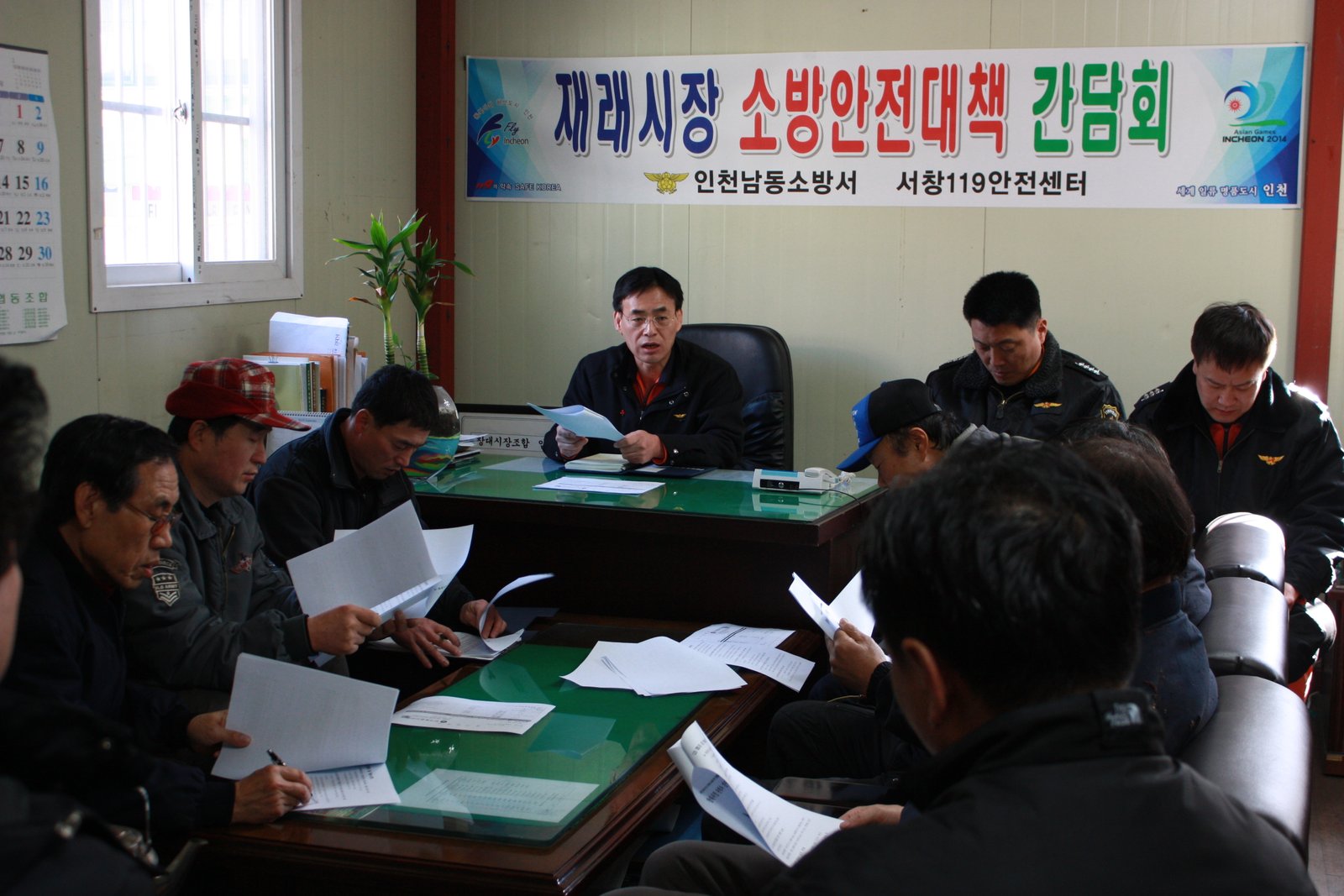 ♨ 이날 간담회는 최근 빈번하게 발생하고 있는 재래시장 화재에 대한 대책을 마련 하고자 시장 관계자, 상인연합회, 의용소방대원 등이 참석한 가운데 실시되었으며 ▲시장 내 화재취약요인 제거 및 개선방안 협의 ▲의용소방대원과 연계한 시장 자율소방대의 화재예방활동 ▲시장관계자 겨울철 화재예방 교육 ▲설날 대비 시장 통로 상 물품적치 등 소방차량 출동 장애요인 대책 강구 ▲기타 화재예방 및 진압 상 문제점과 개선방안 도출 등을 논의하여 화재예방에 만전을 기하고자 했다.