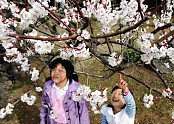 포근한 봄 날씨를 보인 지난 3월17일 제주시 오라동 월정사를 찾은 어린이들이요염한 자태로꽃망울을 터트린 매화를 보며 환하게 웃고 있다.