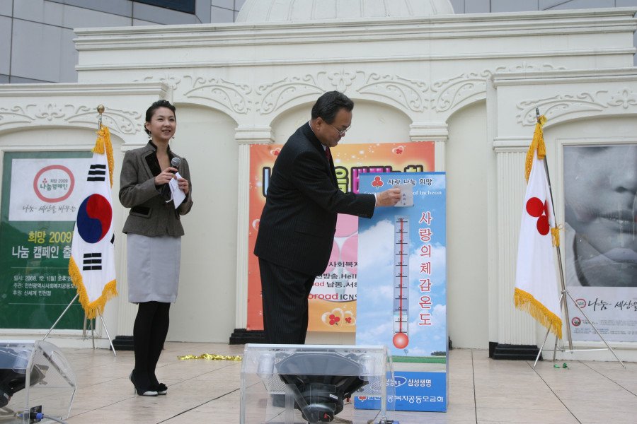 윤태진 남동구청장이 지난 1일 신세계백화점 인천점 중앙광장에서 열린 ‘희망 2009 나눔 캠페인’출범식에 참석해 ‘사랑의 체감 온도탑’제막행사를 마친 뒤 성금을 전달했다.