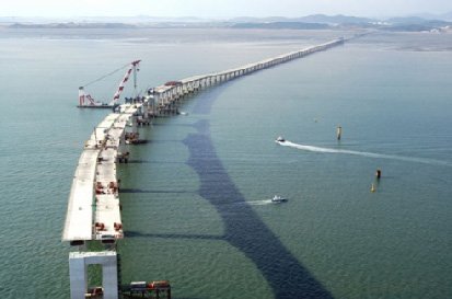 인천국제공항과 송도 국제도시를 연결하는 총연장 18.3㎞의 인천대교가 모습을 드러냈다. 현재까지의 공정률은 70%선이다.