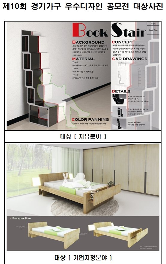 입상자에게는 경기도지사 상장을, 특선 이상 입상자에게는 상장과 함께 부상으로 대상 2명 각 1,000만원, 우수상 2명 각 300만원, 특선 12명 각 50만원의 시상금이 지급된다. 입상작은 오는 8월 22부터 26일까지 킨텍스에서 개최되는 ‘한국국제가구 및 인테리어 산업대전’에도 전시된다.